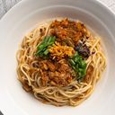 A dish made with long tailed rice noodles, tomato paste, and duck meat
