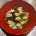 For ref only: Savory soup served with chicken, steamed dumplings, soy sauce, green onion and sesame oil.