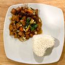 For ref only: Classic Chinese dish with white rice made by stir frying chicken with assorted vegetables