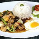 For ref only: Thick starchy gravy sauce stir fried with meat and vegetables paired with steamed rice