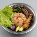 Spicy chili sauce, chicken thighs, cucumbers, lettuce leaves, scrambled eggs, mangoes, and eggplants.