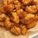 For ref only: A dish consisting of small, bite-sized pieces of chicken that have been breaded and fried and served with sauce