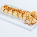 For ref only: ပလာတာလိပ်ထဲတွင် ပဲအနှစ်ထည့်ကာ လိပ်၍ကြော်ပြီးနောက် အချိုးကျခုတ်ပိုင်းပြီး ကြက်သွန်ကြော်ဖြူးထားသော အဆာပြေအစားအစာ