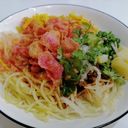 For ref only: တို့ဟူးအကြွပ်ကြော်၊ တို့ဟူး၊ ကြက်သွန်နီ၊ ဆီချက်၊ ငရုတ်သီးမှုန့်၊ နံနံပင်၊ ငံပြာရည်တို့ဖြင့်အရသာရှိစွာသုပ်ထားသော စိန်ပန်းသုပ်
